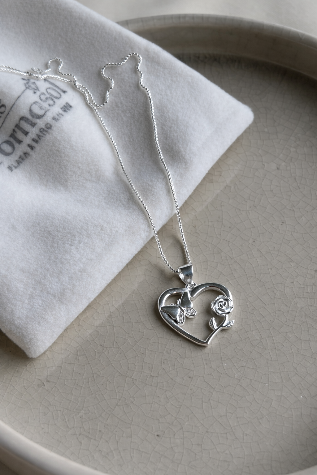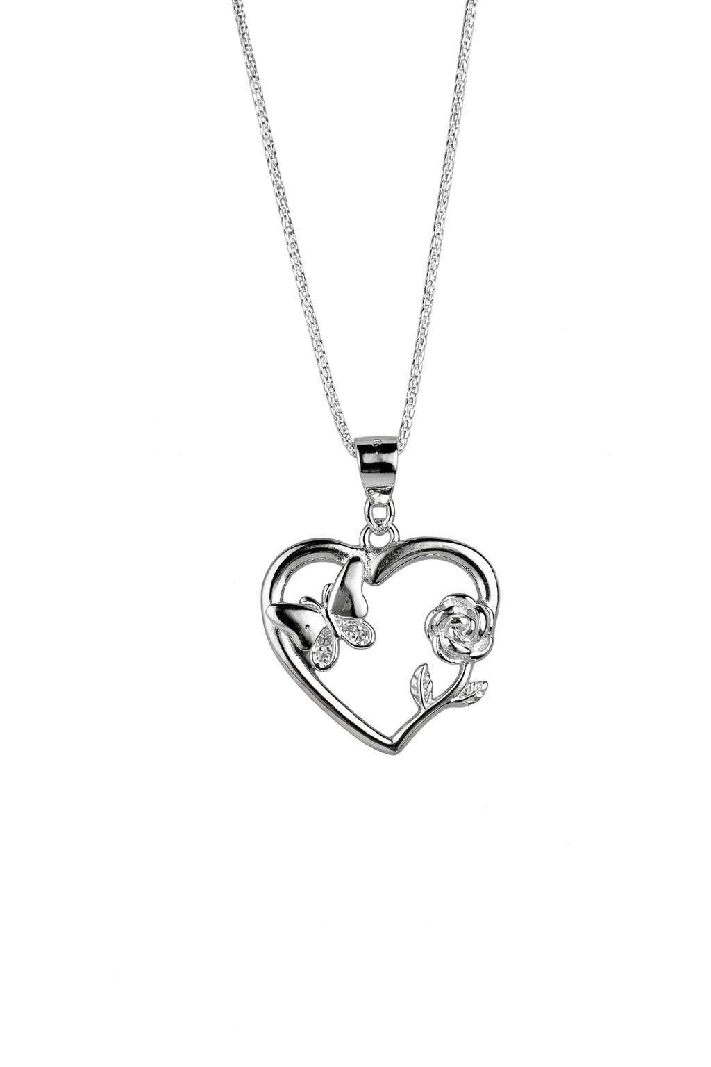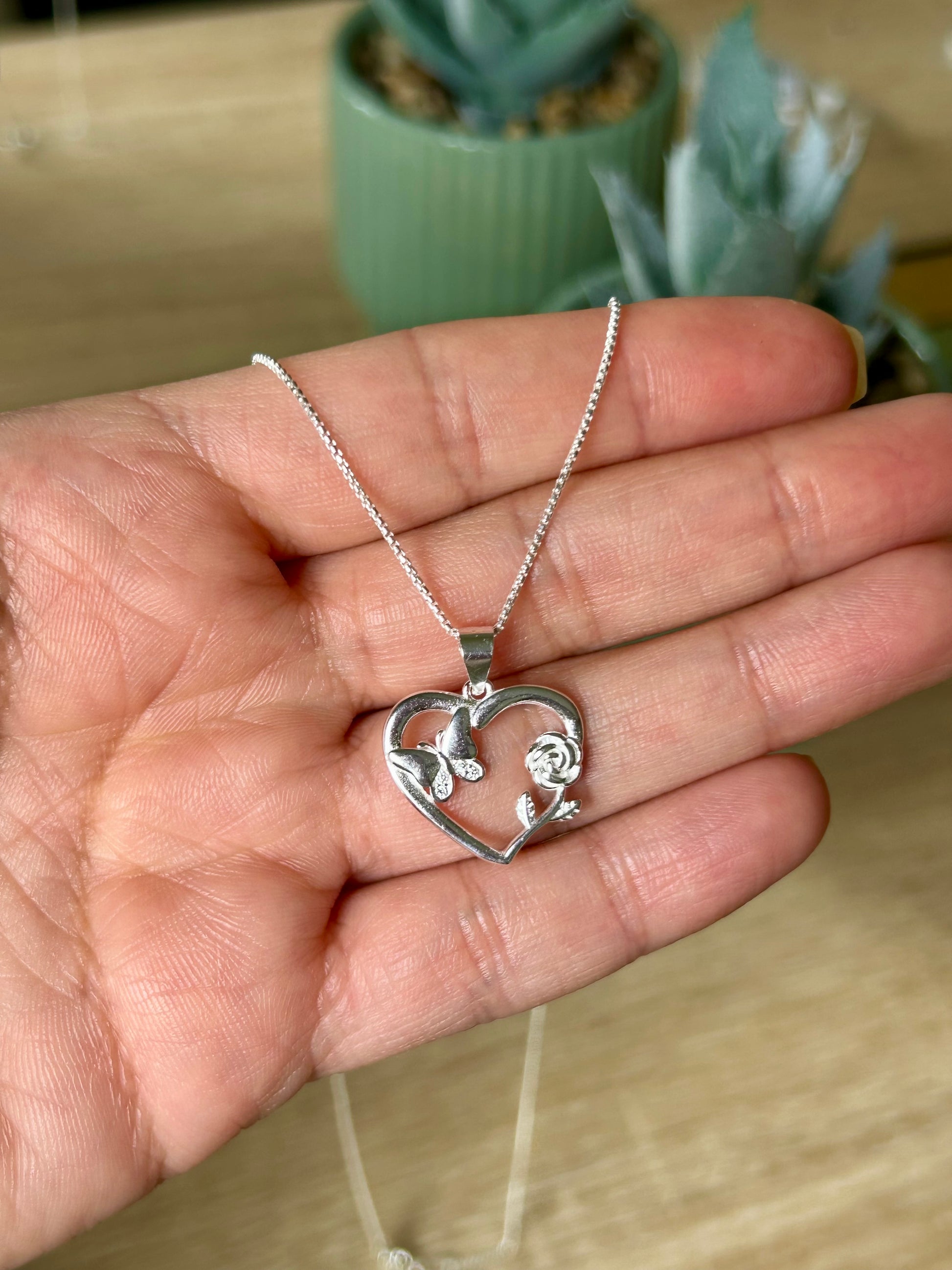 Delicado collar en forma de corazón, elaborado en plata fina Ley 925 italiana. Su diseño incorpora una elegante rosa y una mariposa con detalles de circones, simbolizando amor, transformación y belleza.