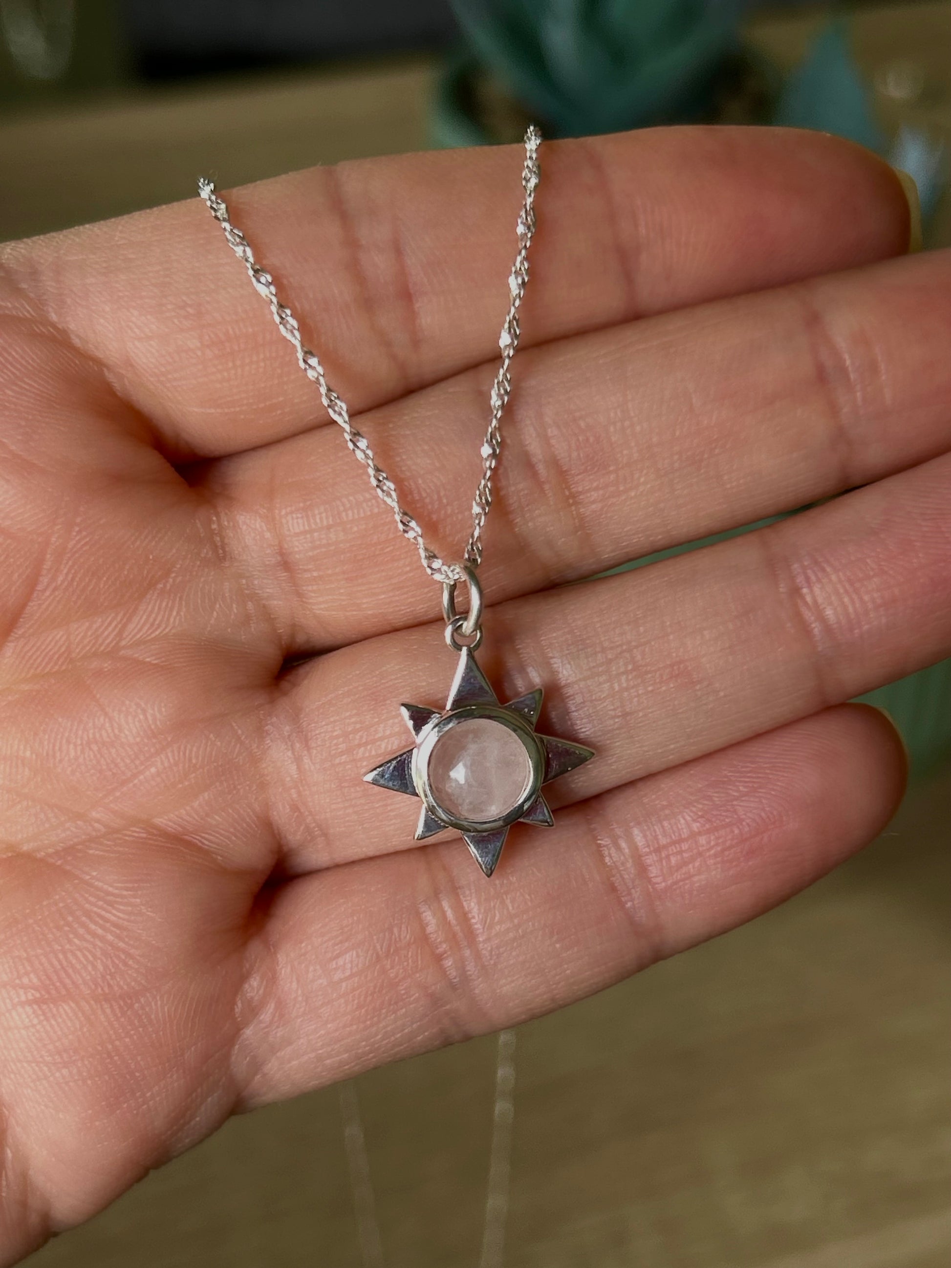 Este collar de sol con cuarzo rosado en plata italiana 925 simboliza la fuerza, la luz y el amor propio, combinando un diseño llamativo con el significado especial de su piedra.